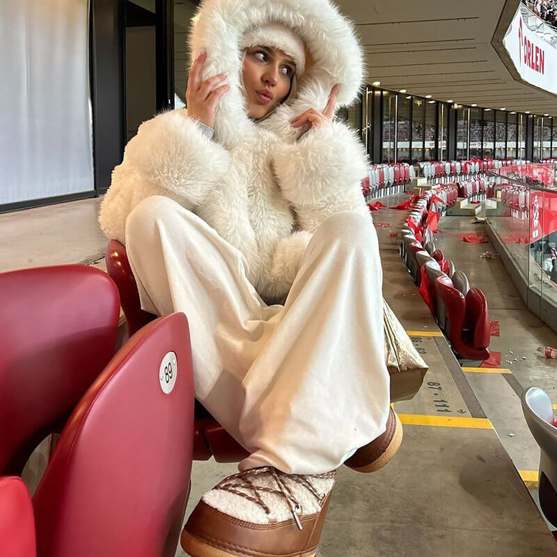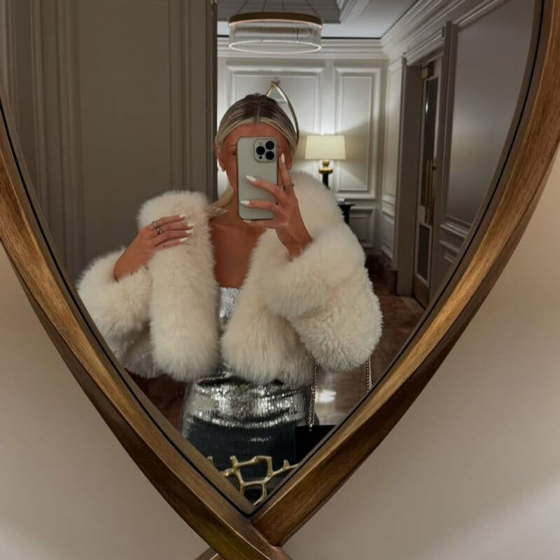 - Lange mouwen met decoratieve elementen: de transparante afwerking en subtiele glinstering zorgen voor extra aandacht voor de armen zonder dat het de rest van de outfit overstemt.